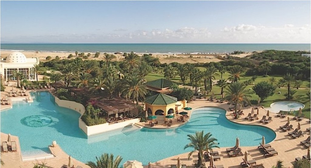 5M. Un cadre enchanteur : un immense jardin, une immense piscine extérieure de 1500m2, un centre de Thalassothérapie (celui-là même qui figure sur de nombreuses publicités pour la Tunisie et que vous avez donc forcément vu) et un Spa Darphin, un Golf…