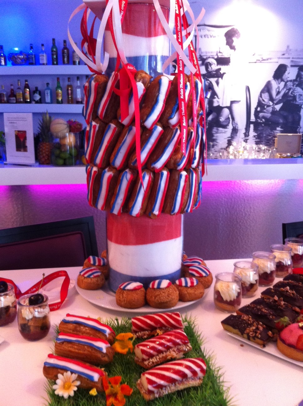 Arrivée dans l’après-midi, je suis allée ensuite demander où je pouvais me restaurer. C’est un des deux seuls (petits) points négatifs et facilement rectifiables du séjour. Si vous arrivez après 14H30, il vous sera impossible de manger du salé au bar (à l’exception des plats du room service, lequel se termine d’ailleurs trop tôt à mon goût) où on vous proposera uniquement des chouquettes maison avec de nombreux parfums au choix…mais…des chouquettes tellement bonnes que j’en ai repris tous les jours avec une préférence pour le praliné et le chocolat au lait, fruits de la passion. Le bar est très agréable avec un vidéo-projecteur diffusant des images de mer et lieux paradisiaques, mais aussi avec sa cheminée, ses bonbons à disposition et son ouverture sur le restaurant et la mer. D’emblée, vous vous sentez à la fois chez vous et ailleurs. En émane un sentiment de douce évasion…