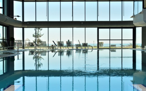 Un puits, à 250 mètres du bord de la plage, permet le pompage de l’eau de mer en fonction de l’heure des marées et permet d’alimenter le Centre de Thalasso de 1490 m2 dont un parcours hydromarin. La piscine d’eau de mer chauffée face à la mer est très agréable et vous propose un vrai moment de bien être, « de poésie » comme vous dirait Mme Dubreuil, la propriétaire des lieux. Il manque des fauteuils autour de la piscine pour se relaxer, néanmoins l’espace autour de celle-ci ne le permet pas forcément et par ailleurs de nombreux fauteuils sont à disposition à l’extérieur et une salle de repos est également mise à disposition de la clientèle. La piscine est ouverte à la clientèle extérieure et surveillée à l’exception du soir, de 20H à 22H, heure jusqu’à laquelle celle-ci reste ouverte uniquement pour la clientèle de l’hôtel. Parmi les soins proposés, vous trouverez des bains chromothérapie aux huiles essentielles, des enveloppements d’algues, des modelages californiens etc. Vous pourrez choisir entre les cures suivantes : remise en forme, forme essentielle, cap minceur, dos et harmonie du corps, coaching vitalité, vip plénitude.