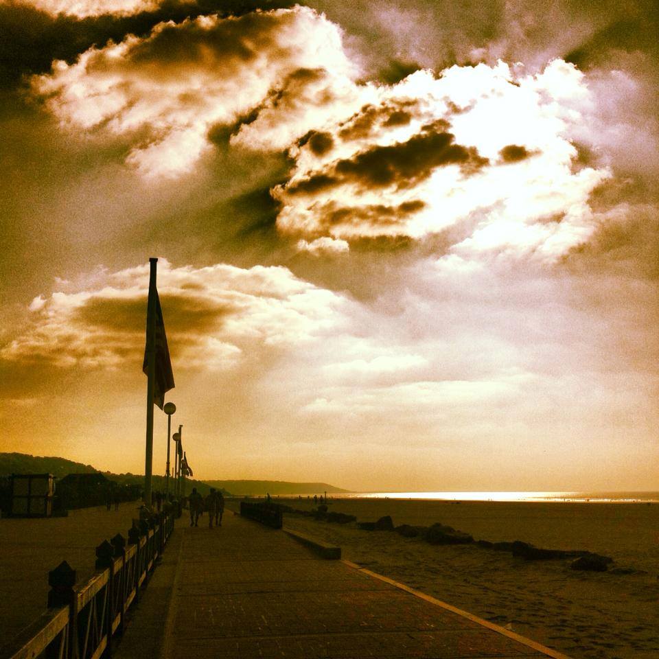 Une journée deauvillaise idéale commence toujours pour moi par une promenade sur les planches, de préférence de bonne heure pour voir le soleil s’y lever, pour admirer la myriade de couleurs que prend alors la mer et dont sont alors auréolées les planches, pour admirer le caractère joliment versatile du paysage. Ces planches, je les ai arpentées des milliers de fois, et il me semble que la vue qui s’y donne à voir n’est jamais la même. L’émotion qu’elles me procurent est en revanche toujours au rendez-vous. Un sentiment de bien-être, une paradoxale mélancolie joyeuse. L’endroit idéal pour forger des rêves impossibles qui, peut-être disparaitront confrontés aux lueurs plus criardes de la réalité, mais naitront à nouveau le lendemain lors d’une nouvelle promenade sur ces mêmes planches à la lumière incroyablement changeante. Et puis il y a les cabines qui jalonnent les planches, ornées des noms des acteurs qui ont fréquenté les festivals de Deauville et qui me rappellent aussi tant de souvenirs. Parfois des chevaux galopent sur la plage. Et tout cela semble sorti tout droit d’un doux songe. Quand il ne me semble pas apercevoir la Mustang de Jean-Louis Trintignant immortalisée par Lelouch dans le sublime « Un homme et une femme » ou cette femme avec son chien qui lui a donné l’idée de ce chef d’œuvre qui a reçu tant de récompenses amplement méritées …Douce confusion entre cinéma et réalité.