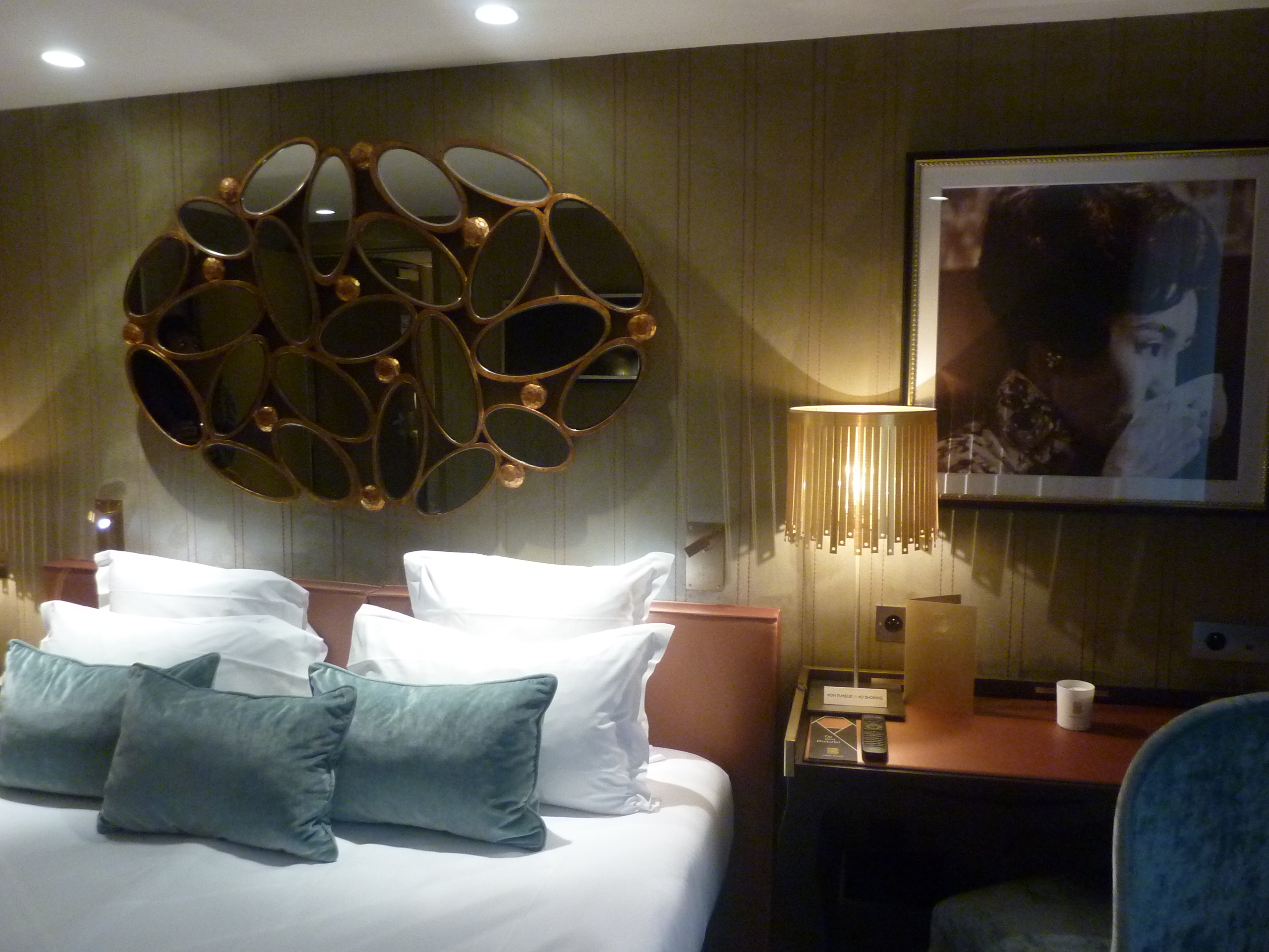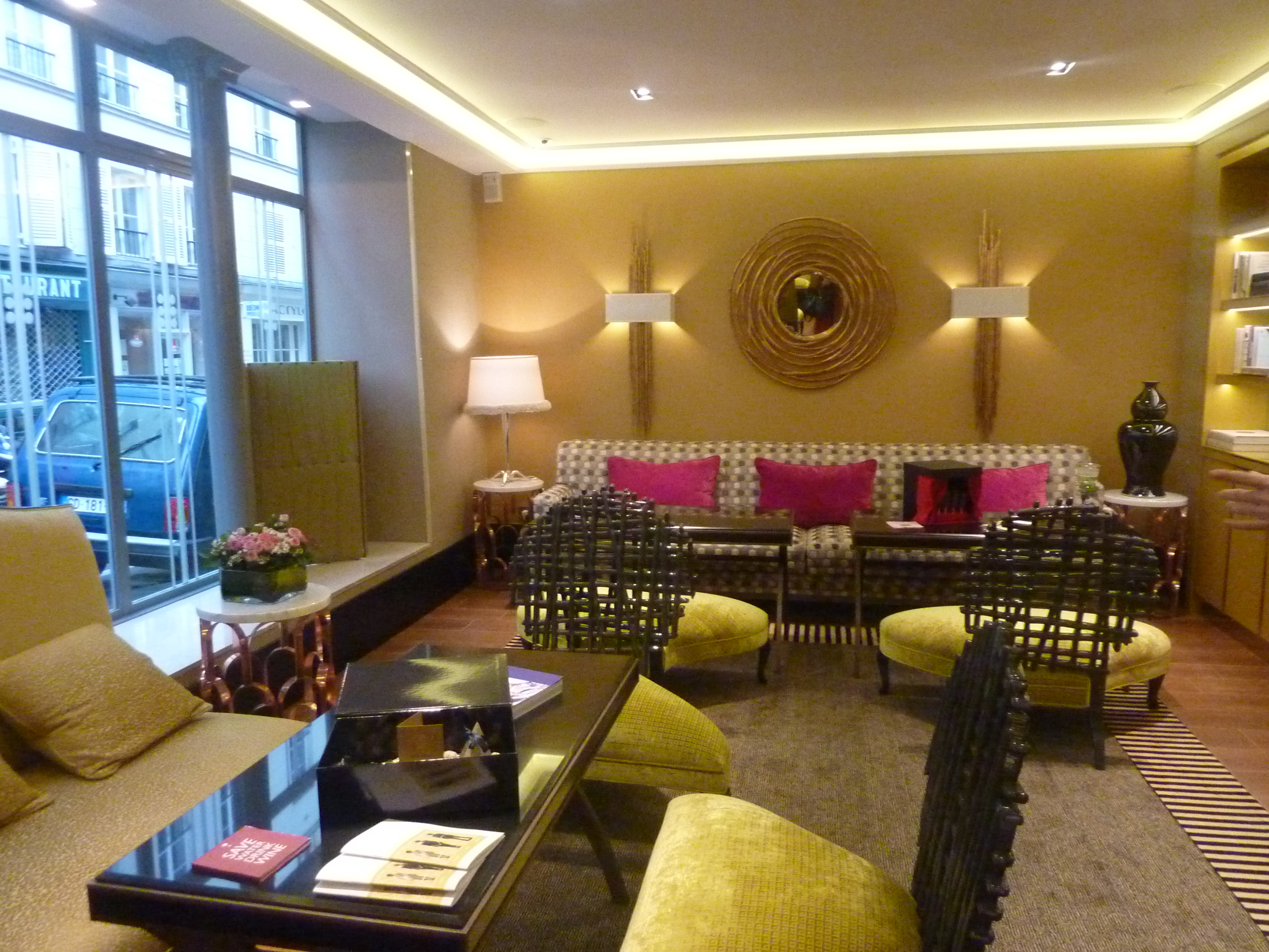 Les plus: l’élégance discrète et originale des chambres, a fortiori les chambres cinéma et club, la décoration singulière(bijoux exposés dans les tables vitrines des chambres Joaillerie, créations d’Anna Rivka, les gravures qui sont des originaux pour la collection »1932″ de la Maison Pernet par Mme Jeannest, splendides miroirs surplombant les lits…) un lieu qui sied parfaitement au quartier et à son charme ensorcelant. Et pour ceux qui veulent se faire plaisir en s’offrant une véritable bulle de bien-être en plein cœur de Paris, je recommande la chambre l’Unique qui bénéficie d’une somptueuse terrasse de 20m2 vous procurant une douce sensation d’ailleurs et de quiétude.