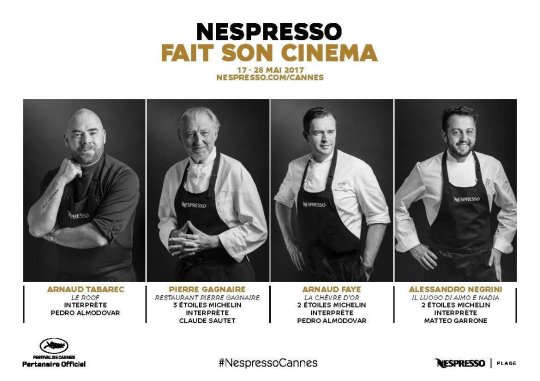 Avant de vous détailler ce dîner mémorable, petit retour sur le partenariat entre Cannes et Nespresso. Cette année, du 17 au 28 mai 2017, Nespresso fêtait ainsi le 10ème anniversaire de son partenariat avec le Festival International du Film de Cannes. Au dîner, les Chefs se succédaient délivrant tour à tour leur interprétation de l’univers d’un réalisateur. Cette année, ce sont Arnaud Tabarec (Restaurant Le Roof, Cannes), Pierre Gagnaire (Restaurant Pierre Gagnaire, Paris, 3*** Michelin), Arnaud Faye (Restaurant La Chèvre d’or, Èze, 2** Michelin) et Alessandro Negrini (Restaurant Il Luogo di Aimo e Nadia, Milan, 2** Michelin) qui ont été retenus au casting de ces dîners d’exception sur la Plage Nespresso. Au sein d’une ambiance rappelant l’univers d’un réalisateur, les Chefs ont offert à déguster une ou plusieurs recettes construites autour des Grands Crus d’exception Nepal Lamjung et Kilimanjaro Peaberry. Jeudi 18 mai 2017, Arnaud Tabarec a ouvert les festivités avec un « Flying Dinner » rendant hommage à l’univers coloré de Pedro Almodovar (président du Jury du Festival de Cannes 2017). L’iconoclaste Pierre Gagnaire a pris la suite les vendredi 19 et samedi 20 mai 2017 pour des dîners aussi sensibles et inspirés que l’univers de Claude Sautet, réalisateur choisi par le Chef. Autre surdoué de la cuisine Française, Arnaud Faye, récemment nommé à la tête du restaurant La Chèvre d’Or où il défend deux étoiles, s’est lui aussi frotté à l’univers chaleureux de Pedro Almodovar lors de dîners les mardi 23 et mercredi 24 mai 2017. Enfin, Alessandro Negrini, acolyte de Fabio Pisani au restaurant doublement étoilé Il Luogo di Aimo e Nadia à Milan a clôturé le bal le vendredi 26 mai 2017. Pour son dîner, le Chef Italien a rendu hommage à l’univers d’un autre italien : Matteo Garrone (Gomorra, Tale of Tales).
