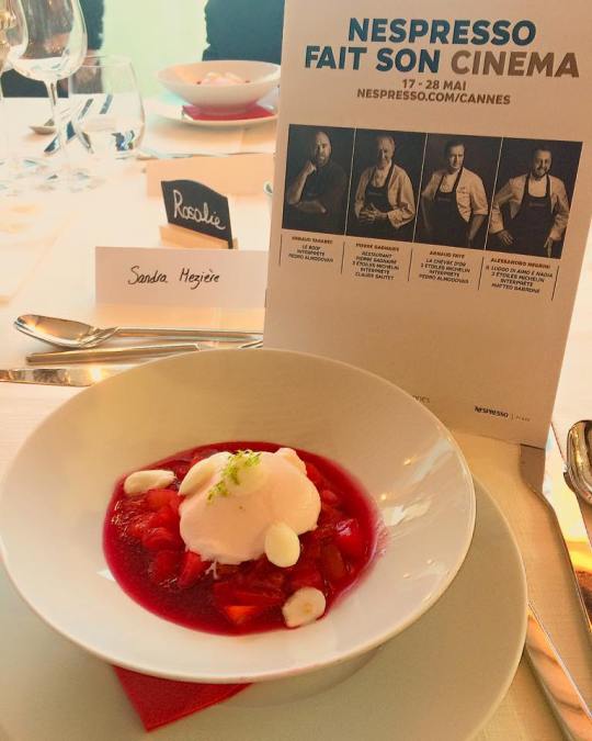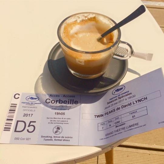 Enfin, le dîner fut accompagné de Ventoux rosé, Domaine de la Fondrèche 2016, Condrieu les Terrasses du Palat, Domaine François Villard, 2015, Sancerre La Croix du Roy 2012, Mas Jullien, Cartagene, 2°15 (accords mets vins par Fabrice Sommier, meilleur ouvrier de France 2007) et enfin de grands crus Nespresso (j’avoue m’être délectée de leur capuccino grand cru tout au long du festival comme cet autre soir -photo ci-dessus- avant la projection de Twin Peaks…).