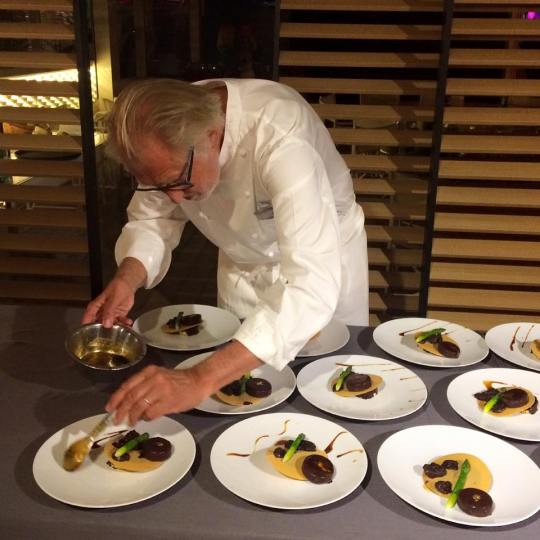 La bonne humeur communicative et l’affabilité remarquable du chef qui semble ne jamais se départir de ce sourire franc qui le caractérise et le distingue avaient sans doute aussi contaminé les lieux. Son sens de l’écoute, son regard bienveillant, son sourire lumineux respirent la générosité non feinte et l’humilité de celui qui est pourtant auréolé du titre de « plus grand chef au monde ». C’est avec la même générosité et bonne humeur qu’il nous a ensuite décrit les plats que nous allions déguster avec la conscience du privilège de vivre ces instants culinaires d’exception (pas plus de 40 convives à la demande de Pierre Gagnaire). « Les films de Claude Sautet touchent tous ceux qui privilégient les personnages par rapport aux situations, tous ceux qui pensent que les hommes sont plus importants que ce qu’ils font (..). Claude Sautet c’est la vitalité. », disait Truffaut. Cette phrase pourrait aussi s’appliquer à Pierre Gagnaire.