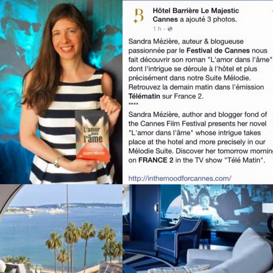 En avril 2016, les Editions du 38 publiaient mon premier roman « L’amor dans l’âme » dont l’intrigue se déroule principalement dans le cadre du Festival de Cannes et notamment à l’hôtel Barrière Le Majestic et dans sa suite « Mélodie » (inspirée du film « Mélodie en sous-sol » d’Henri Verneuil.) Merci à l’hôtel Le Majestic de m’avoir mise à l’honneur, ainsi que mon roman, à l’occasion de ce 70ème Festival de Cannes. Cliquez ici pour accéder à la page de mon éditeur consacrée au roman et pour en savoir plus.