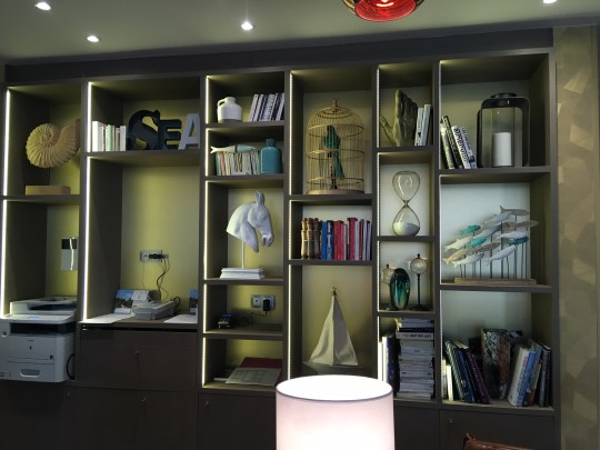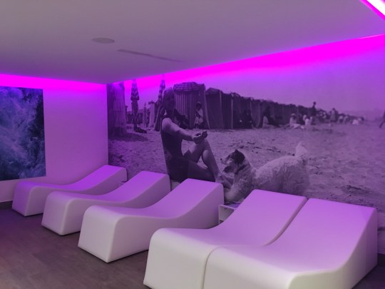 Piscine décorée dans l’esprit lounge : murs et plafonds acoustiques, fauteuils qui rappellent les cabines de bord de mer, lits de repos etc..