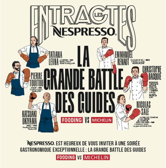 Cette année, du 8 au 19 mai, les dîners Nespresso changeaient un peu de forme et n’avaient plus pour thèmes des chefs-d’œuvre du septième art. Cette année, Nespresso et Le Fooding ont en effet inventé les « Entractes Nespresso » ! Au programme ? Quatre dîners organisés par des stars de cinéma avec leur chef préféré mais aussi la Grande Battle opposant trois chefs du guide Fooding à trois chefs du guide Michelin et, le matin, un petit déjeuner healthy, locavore et ciné autour d’un café Vertuo pour tout effacer et mieux repartir…