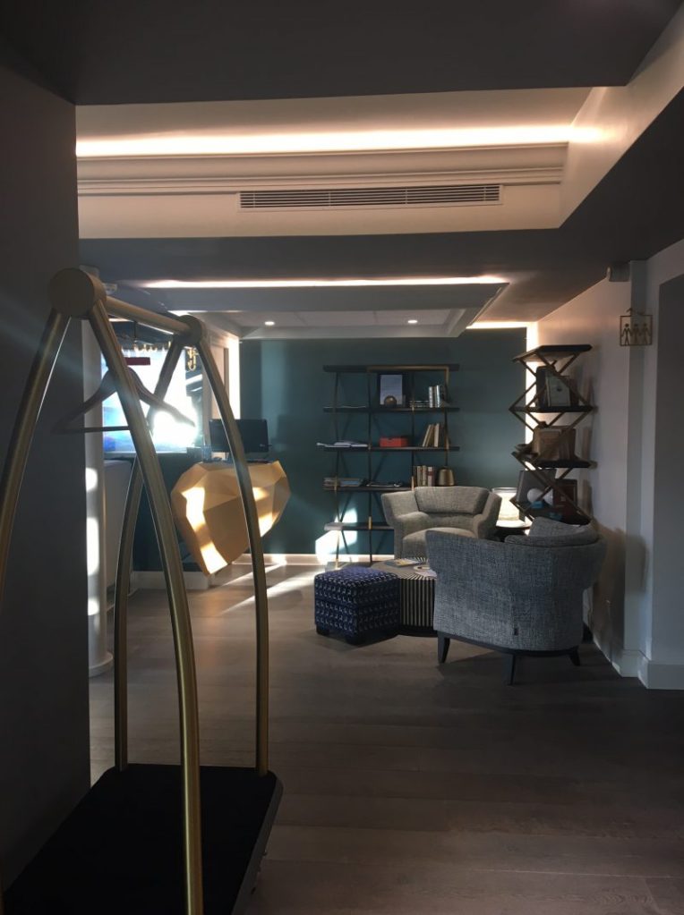 Sur la droite de l’entrée, se trouvent le restaurant le Gaya et le bar qui dominent l’océan et, face à nous, une longue série de couloirs labyrinthiques qui desservent les chambres et le Spa Nuxe.
