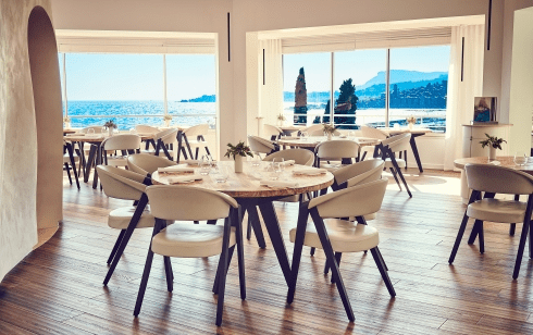 Au pied des montagnes, en surplomb sur la mer, à deux pas de la frontière italienne, la bâtisse années 30 en rotonde qui abrite le Mirazur offre un décor idyllique. Immergée dans une végétation luxuriante, elle se décline à flanc de colline sur trois niveaux. La salle de restaurant spacieuse, élégante et lumineuse embrasse la mer à perte de vue et la ville de Menton à travers une longue baie circulaire.