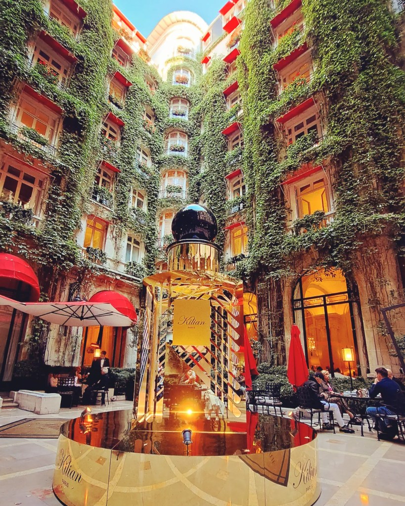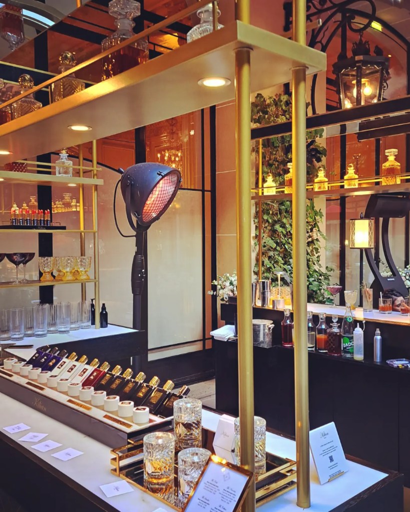 Dans la Cour Jardin de l’hôtel dominait ainsi une carafe Kilian Paris à grande échelle – création signature de la marque – donnant sur le bar éphémère.