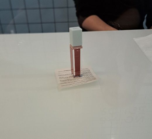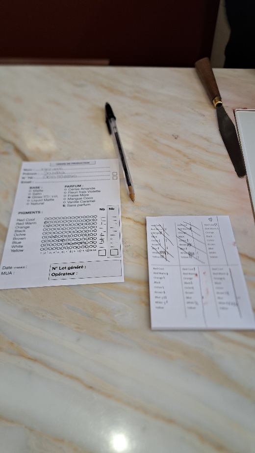 Une fois la couleur et la texture correspondant à vos attentes établies par la Make up Artist Experte devant vous selon vos demandes et les nuances que vous lui indiquerez vouloir (comme un peintre qui mélangerait ses couleurs pour atteindre la teinte parfaite), votre rouge à lèvres sera réalisé (devant vous là aussi mais cette fois derrière une vitre), en 10 minutes, avec la composition inscrite sur une feuille qui vous sera remise avec celui-ci.